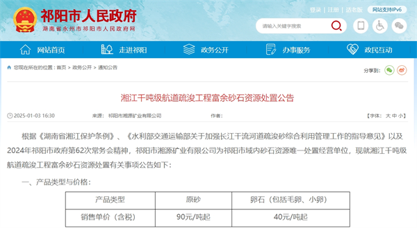 近日,湖南祁陽市人民政府發(fā)布湘江千噸級航道疏浚工程富余砂石資源處置公告,共處置原砂、卵石等砂石產(chǎn)品,其中,原砂銷售單價(含稅)90元/噸起、卵石(包括毛卵、小卵)銷售單價(含稅)40元/噸起。