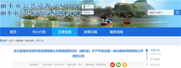1月8日,浙江省麗水市公共資源交易中心發(fā)布慶元縣綠慶資源開發(fā)管理有限公司普通建筑石料(凝灰?guī)r)礦產開發(fā)運營一體化服務采購項目招標公告,投標截止時間2025年2月6日。該項目生產規(guī)模為533萬噸/年,服務期限為5年(8個月內完成礦山前期建設及設備安裝調試實現開機試生產),礦山資源開發(fā)費用固定綜合預算單價為37元/噸-39元/噸(含稅)。