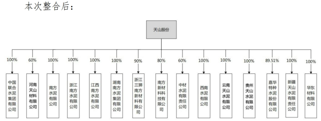 1、中聯(lián)水泥:以中國聯(lián)合水泥集團(tuán)有限公司為主體,管理相關(guān)子公司,其現(xiàn)注冊(cè)資本為100億元人民幣,本次整合前后均由天山股份持有100%股權(quán)。