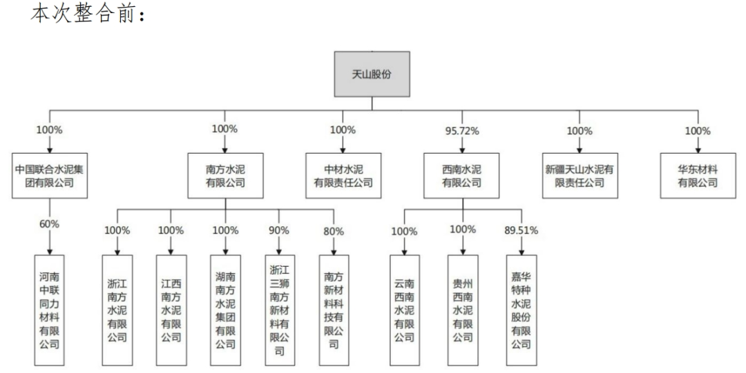 3、南方水泥:基于本次整合,由南方水泥有限公司吸收合并上海南方水泥有限公司,管理相關(guān)子公司,南方水泥有限公司現(xiàn)注冊(cè)資本約為110.14億元人民幣,本次整合前后均由天山股份持有100%股權(quán)。