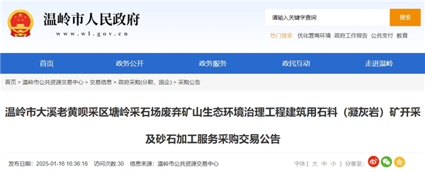 1月16日,浙江省臺州市溫嶺市人民政府發(fā)布大溪老黃唄采區(qū)塘嶺采石場廢棄礦山生態(tài)環(huán)境治理工程建筑用石料(凝灰?guī)r)礦開采及砂石加工服務第三次招標公告,投標截止時間2025年2月14日9時。