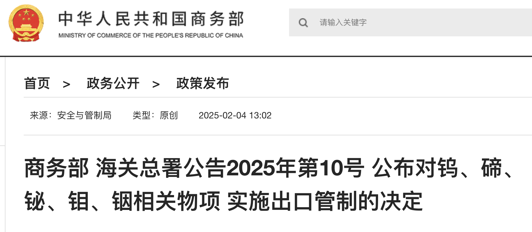 商務(wù)部 海關(guān)總署公告2025年第10號 公布對鎢、碲、鉍、鉬、銦相關(guān)物項 實施出口管制的決定