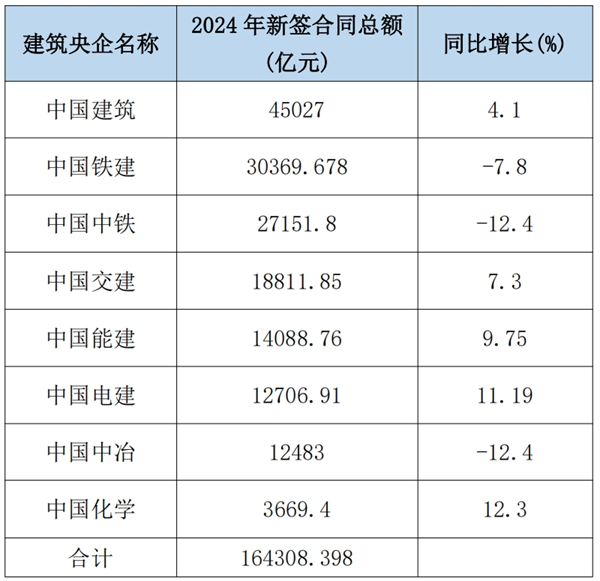 近期,中國(guó)建筑、中國(guó)中鐵、中國(guó)鐵建、中國(guó)交建、中國(guó)電建、中國(guó)能建、中國(guó)中冶、中國(guó)化學(xué)等8大建筑央企發(fā)布2024年經(jīng)營(yíng)公告。2024年,8大建筑央企完成新簽合同額超16.43萬(wàn)億元,整體完成年度比例為95.59%。其中,5家建筑央企新簽合同額增加,3家減少。