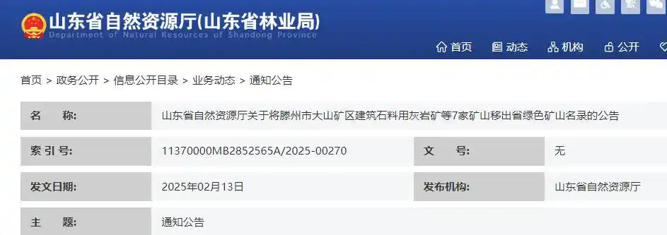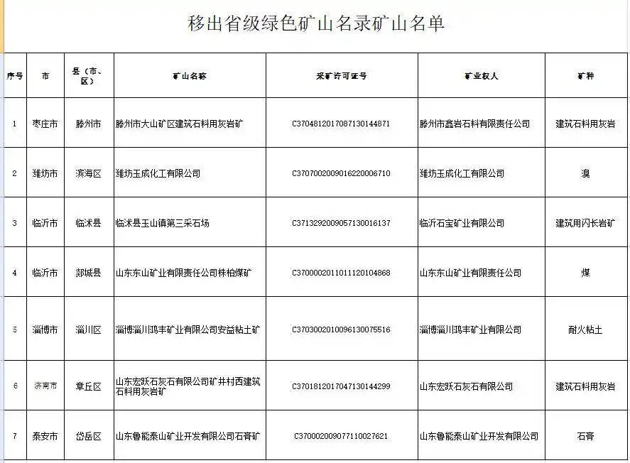公告稱,按照《自然資源部辦公廳關于印發(fā)〈國家級綠色礦山名錄移出管理工作要求〉的函》(自然資辦函〔2025〕68號)等文件精神,經(jīng)有關市核實、征求省直有關單位意見和廳長辦公會研究通過,決定取消滕州市大山礦區(qū)建筑石料用灰?guī)r礦等7家礦山省級綠色礦山稱號,移出省綠色礦山名錄。