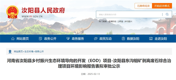 近日,河南洛陽汝陽縣人民政府發(fā)布河南省洛陽市汝陽縣鄉(xiāng)村振興生態(tài)環(huán)境導向的開發(fā)(EOD)項目——汝陽縣東溝鉬礦剝離廢石綜合治理項目環(huán)境影響報告表擬審批公示。該項目總投資約7.05億元,其中,環(huán)保投資225萬元,主要建設(shè)年綜合處理量為1000萬噸的砂石骨料生產(chǎn)線、廠房、原料庫、成品庫等附屬設(shè)施及相關(guān)工藝設(shè)備等。