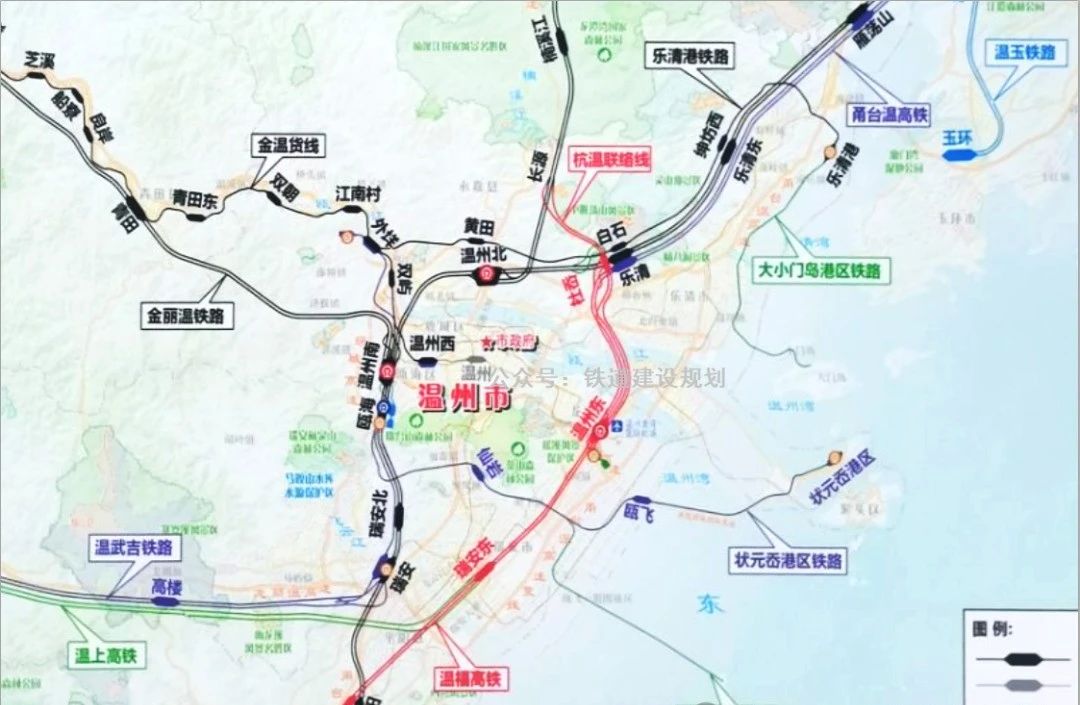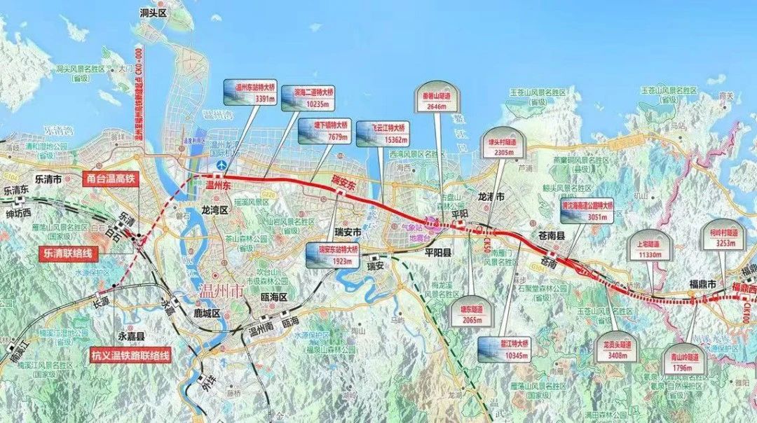 溫福高鐵起點(diǎn)樂清站(不含),經(jīng)溫州東站至福州南站,正線長約302.44km。其中浙江境內(nèi)長約98.86km。沿線設(shè)4個(gè)車站,其中新建溫州東站(機(jī)場西側(cè))、瑞安東站,平陽騎跨站、蒼南并站。設(shè)計(jì)速度為350公里/小時(shí)。