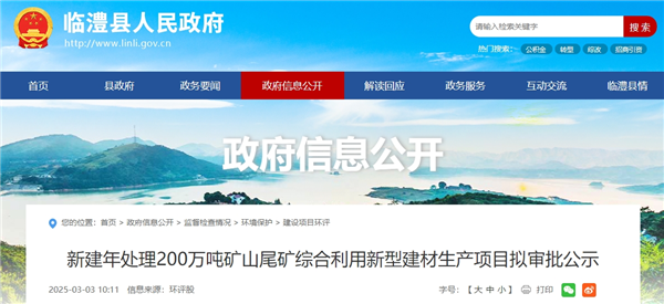 3月3日,湖南省常德市臨澧縣人民政府發(fā)布新建年處理200萬(wàn)噸礦山尾礦綜合利用新型建材生產(chǎn)項(xiàng)目擬審批公示,建設(shè)單位為常德市招財(cái)新型材料有限公司。