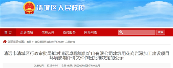 3月11日,廣東省清遠市清城區(qū)人民政府發(fā)布擬對清遠卓鵬智能礦山有限公司建筑用花崗巖深加工建設(shè)項目環(huán)評做出批準決定的公示。據(jù)悉,該項目屬于“清遠市清城區(qū)源潭鎮(zhèn)青龍深木窿建設(shè)用花崗巖礦投資建設(shè)項目”的配套項目,年產(chǎn)花崗巖碎石591.75萬噸、機制砂187.38萬噸、水洗砂3.15萬噸。