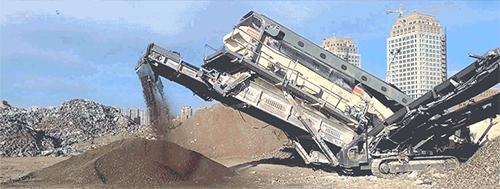 物料首先通過ST2.8移動(dòng)式重篩進(jìn)行預(yù)篩分。之后,50 mm以上的篩上物料被送入LT1213S反擊破進(jìn)行破碎。在反擊破內(nèi),混凝土、碎石及磚塊等物料在高速轉(zhuǎn)動(dòng)的轉(zhuǎn)子帶動(dòng)下,受到板錘的沖擊而瞬間破碎。破碎后的物料經(jīng)主皮帶排出,主皮帶上方的除鐵器分揀出鋼筋、鐵塊等。