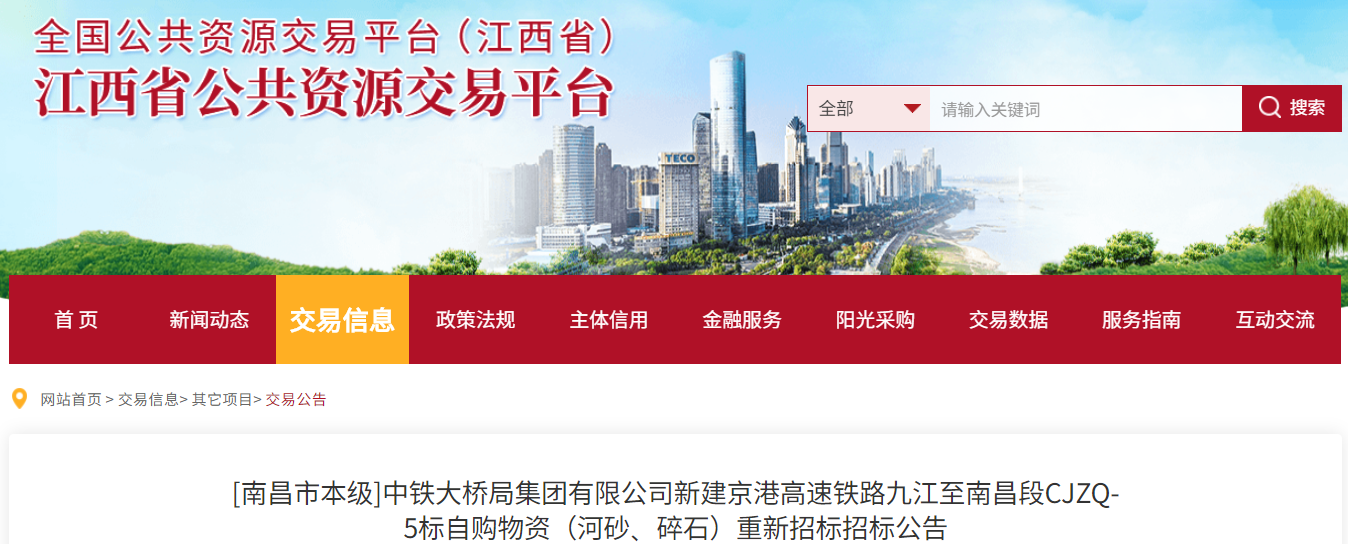 近日,中鐵大橋局集團有限公司發(fā)布新建京港高速鐵路九江至南昌段CJZQ-5標(biāo)自購物資(河砂、碎石)重新招標(biāo)公告,在此之前,項目曾于2025年2月14日發(fā)布過招標(biāo)公告,但招標(biāo)失敗,現(xiàn)對自購物資河砂、碎石進行重新招標(biāo)。