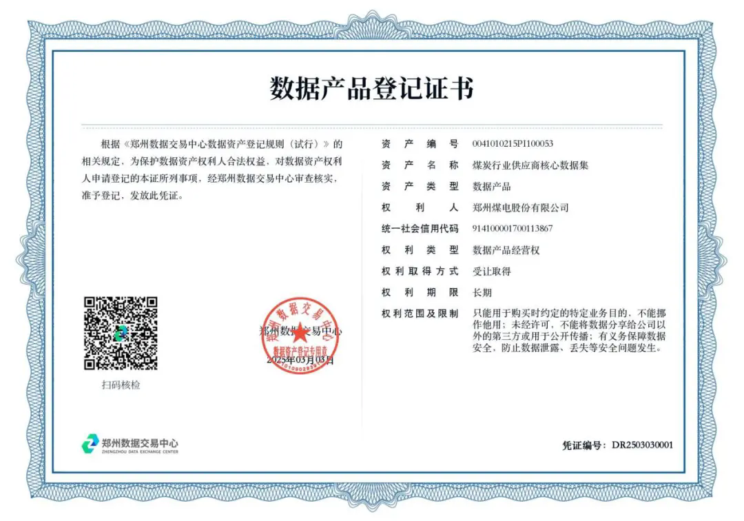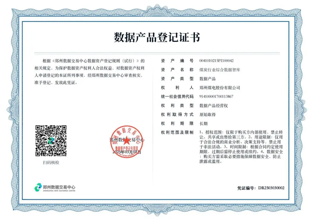 據(jù)鄭煤集團消息,近日,鄭州煤電股份有限公司自主開發(fā)的“煤炭行業(yè)綜合數(shù)據(jù)智庫”“煤炭行業(yè)供應(yīng)商核心數(shù)據(jù)集”兩款數(shù)據(jù)產(chǎn)品通過公示,獲得“數(shù)據(jù)產(chǎn)品登記證書”,正式在鄭州數(shù)據(jù)交易中心登記掛牌,此為河南省煤炭行業(yè)首批數(shù)據(jù)產(chǎn)品登記憑證。