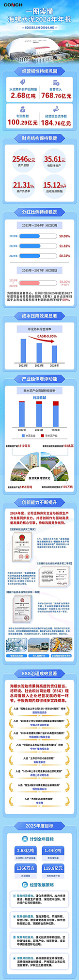 3月24日,海螺水泥公告稱,2024年實(shí)現(xiàn)營業(yè)收入910.3億元,同比下降35.51%;歸屬于上市公司股東的凈利潤為76.96億元,同比下降26.19%。公司擬每股派發(fā)現(xiàn)金紅利0.71元人民幣(含稅),不實(shí)施公積金轉(zhuǎn)增股本。報(bào)告期內(nèi),本集團(tuán)增加熟料產(chǎn)能230萬噸(海外),通過遷建等方式新增水泥產(chǎn)能800萬噸,新增骨料產(chǎn)能1,450萬噸、商品混凝土產(chǎn)能1,210萬立方米、光儲發(fā)電裝機(jī)容量103兆瓦。截至報(bào)告期末,本集團(tuán)擁有熟料產(chǎn)能2.74億噸,水泥產(chǎn)能4.03億噸,骨料產(chǎn)能1.63億噸,在運(yùn)行商品混凝土產(chǎn)能5,190萬立方米,在運(yùn)行光儲發(fā)電裝機(jī)容量645兆瓦。海螺水泥預(yù)計(jì)2025年骨料銷量為1.44億噸。