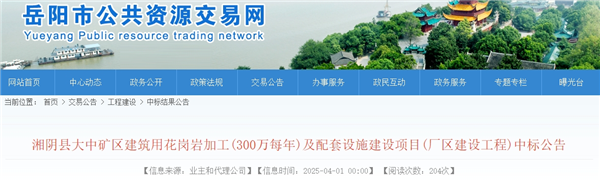 4月1日,湖南省岳陽市公共資源交易網(wǎng)發(fā)布湘陰縣大中礦區(qū)建筑用花崗巖加工(300萬每年)及配套設(shè)施建設(shè)項(xiàng)目(廠區(qū)建設(shè)工程)中標(biāo)公告,湖南建投六建集團(tuán)(湖南省第六工程有限公司)以近1.58億元中標(biāo)該項(xiàng)目。