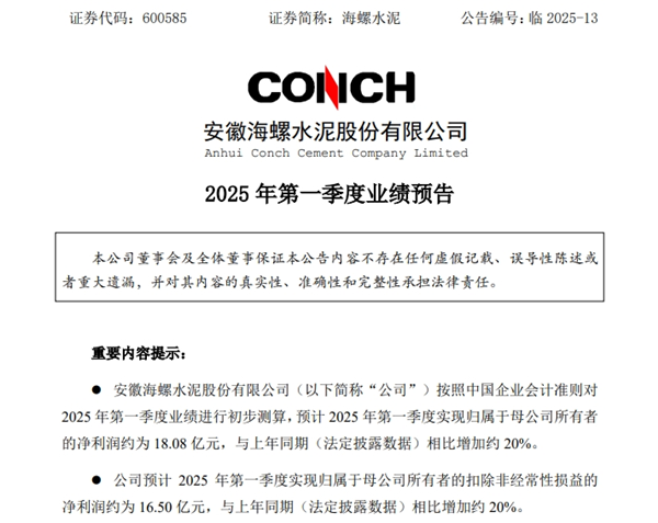4月8日,海螺水泥發(fā)布2025年第一季度業(yè)績預(yù)告,公司預(yù)計實現(xiàn)歸母凈利潤約18.08億元,同比增加約20%;扣非凈利潤約16.5億元,同比增加約20%。對于2025年第一季度業(yè)績預(yù)增的主要原因,海螺水泥表示,主要由于公司產(chǎn)品成本下降及銷量上升所致。