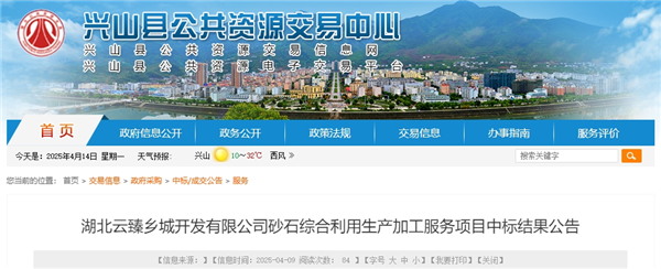 日前,湖北云臻鄉(xiāng)城開(kāi)發(fā)有限公司砂石綜合利用生產(chǎn)加工服務(wù)項(xiàng)目公布中標(biāo)結(jié)果。當(dāng)?shù)匾幻衿?mdash;—興山淦輝建筑工程有限責(zé)任公司中標(biāo)該項(xiàng)目,中標(biāo)(成交)單價(jià)14.76元/噸。