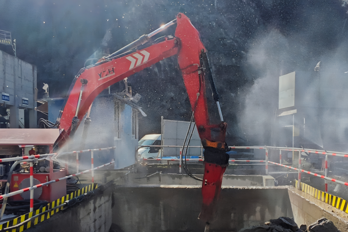 據(jù)悉,骨料粗碎工藝環(huán)節(jié)常存在石料粒徑過大導(dǎo)致給料機(jī)堵料的情況,過往人工處理大塊石起拱、堵料等危險(xiǎn)作業(yè)存在較大施工安全隱患,且影響施工生產(chǎn)效率。經(jīng)水電七局雙江口砂石工區(qū)安委會(huì)實(shí)地測(cè)算、模擬試驗(yàn)后,將礦山行業(yè)成熟的“遠(yuǎn)程遙控式機(jī)械臂”運(yùn)用至水電項(xiàng)目中,用以疏通大塊石堵料問題,利用前端破碎錘對(duì)目標(biāo)石料進(jìn)行破碎處理,降低人工作業(yè)安全風(fēng)險(xiǎn),提高施工生產(chǎn)效率。