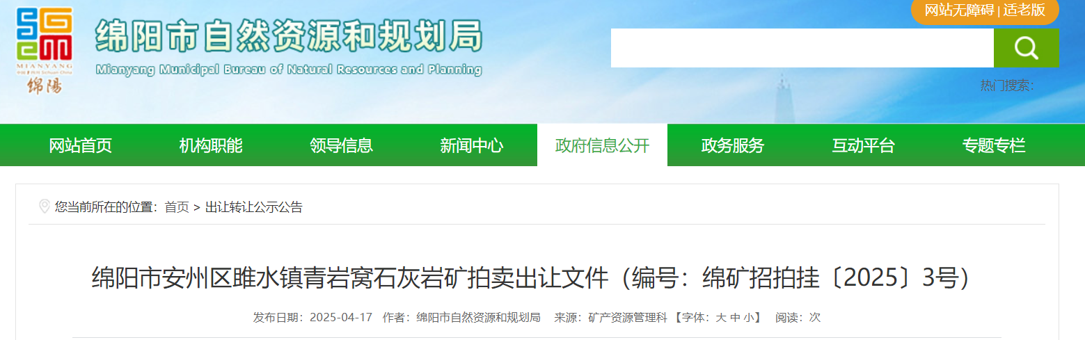 近日,四川省綿陽市掛牌出讓綿陽市安州區(qū)雎水鎮(zhèn)青巖窩石灰?guī)r礦,該礦開采境界內石灰?guī)r、白云巖礦資源量共計3996.8萬m³(10521.18萬噸),其中石灰?guī)r礦資源量3321.0萬m³(8668.21萬噸),白云巖礦資源量675.8萬m³(1852.97萬噸),出讓年限28年,生產規(guī)模350萬噸/年,起始價1.8億元。