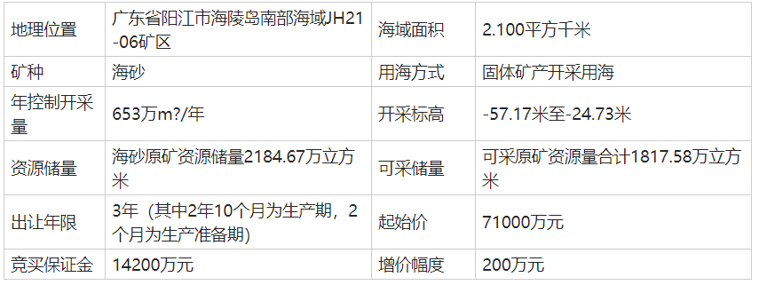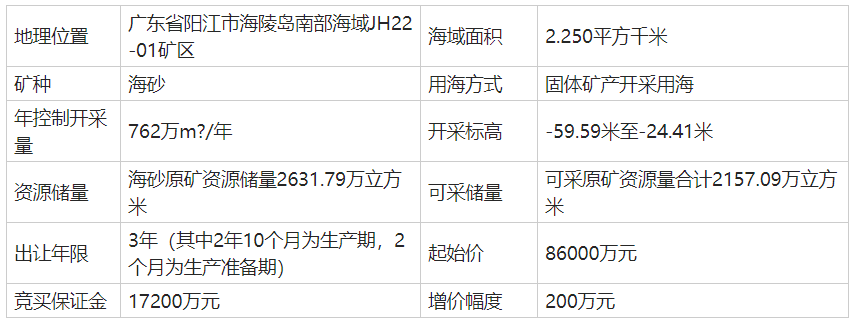近日,廣東省公共資源交易平臺(tái)顯示,廣東陽(yáng)江出讓海陵島南部海域JH21-06、JH22-01兩礦區(qū)海砂開(kāi)采海域使用權(quán)和采礦權(quán)。兩個(gè)海砂項(xiàng)目,起始價(jià)合計(jì)15.7億,資源儲(chǔ)量共計(jì)4816.46萬(wàn)方,年開(kāi)采量共計(jì)1415萬(wàn)方/年。