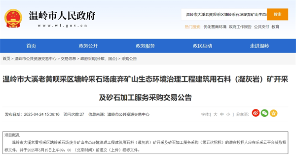 據(jù)浙江溫嶺市公共資源交易中心消息,溫嶺市大溪老黃唄采區(qū)塘嶺采石場(chǎng)廢棄礦山生態(tài)環(huán)境治理工程建筑用石料(凝灰?guī)r)礦開(kāi)采及砂石加工服務(wù)項(xiàng)目第5次招標(biāo)。該項(xiàng)目資源量約291.62萬(wàn)噸,預(yù)算金額5408.16萬(wàn)元。投標(biāo)上限單價(jià)方面,宕渣8.5元/噸,普通碎石18.65元/噸,整型精品碎石20元/噸。