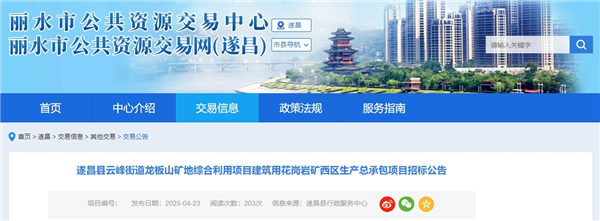 4月23日,浙江省麗水市公共資源交易中心發(fā)布遂昌縣云峰街道龍板山礦地綜合利用項(xiàng)目建筑用花崗巖礦西區(qū)生產(chǎn)總承包項(xiàng)目招標(biāo)公告,2025年5月14日投標(biāo)截止。