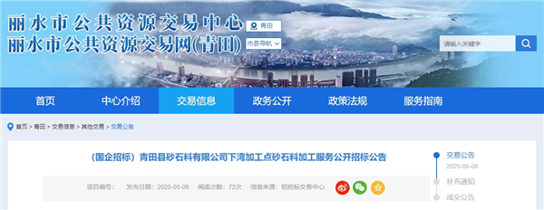 近日,浙江省麗水市公共資源交易中心發(fā)布青田縣砂石料有限公司下灣加工點(diǎn)砂石料加工服務(wù)公開招標(biāo)公告,投標(biāo)截止時間為2025年5月28日。該項(xiàng)目石料暫估600萬噸,最高單價限價15.8元/噸,預(yù)算金額9480萬元,要求投標(biāo)人生產(chǎn)的砂子含泥量≤5%,磨度細(xì)數(shù)≤2.5mm。