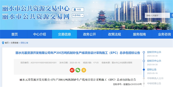 日前,浙江麗水市公共資源交易網(wǎng)發(fā)布麗水元基資源開發(fā)有限公司年產(chǎn)200萬噸機制砂生產(chǎn)線項目設計采購施工(EPC)總承包招標公告。該工程總承包包括兩個項目,招標控制價超4971.26萬元。其中項目(一期)控制價超3527.11萬元、項目(二期)控制價約1444.15萬元。