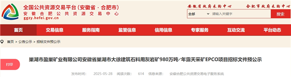 近日,安徽合肥公共資源交易中心發(fā)布巢湖市盈巢礦業(yè)有限公司大徐建筑石料用灰?guī)r礦980萬噸/年露天采礦EPCO項(xiàng)目招標(biāo)文件預(yù)公示,即將招標(biāo)。該項(xiàng)目合同估算價(jià)近3.5億元。