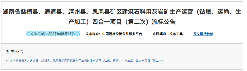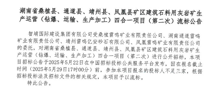 近日,湖南省桑植縣、通道縣、靖州縣、鳳凰縣礦區(qū)建筑石料用灰?guī)r礦生產(chǎn)運營(鉆爆、運輸、生產(chǎn)加工)四合一項目(第二次)因投標(biāo)人不足三家流標(biāo)。項目生產(chǎn)總規(guī)模為年產(chǎn)760萬噸,資金來源為自籌資金42718萬元。