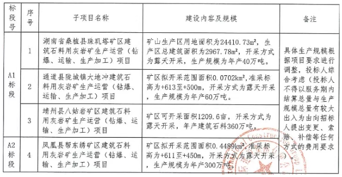 湖南省桑植縣、通道縣、靖州縣、鳳凰縣礦區(qū)建筑石料用灰?guī)r礦生產(chǎn)運營(鉆爆、運輸、生產(chǎn)加工)四合一項目己由項目審批/核準(zhǔn)/備案機關(guān)批準(zhǔn),項目資金來源為自籌資金42718萬元,招標(biāo)人為桑植雷鳴礦業(yè)有限責(zé)任公司、湖南通道雷鳴礦業(yè)有限責(zé)任公司、靖州雷鳴億安砂石有限公司、鳳凰雷鳴礦業(yè)有限責(zé)任公司。生產(chǎn)總規(guī)模為年產(chǎn)760萬噸。
