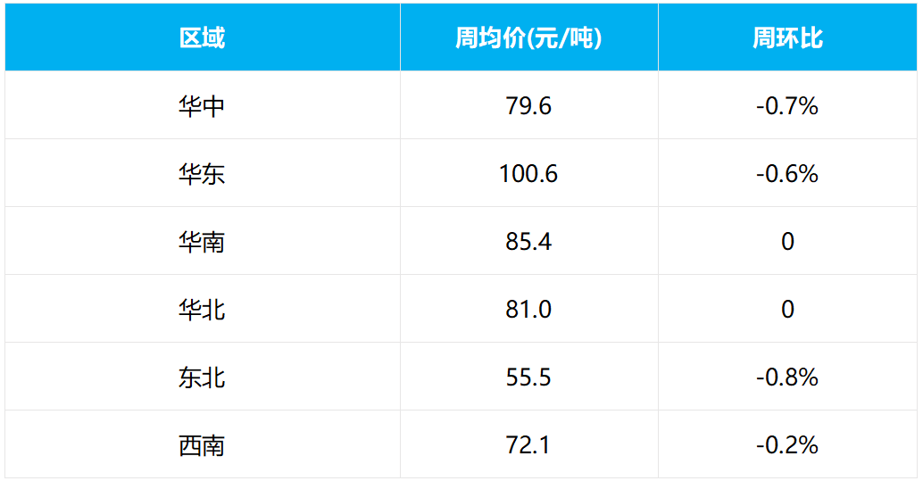 從全國重點區(qū)域砂石價格來看,華中砂石周均價79.6元/噸,周環(huán)比下降0.7%;華東砂石周均價100.6元/噸,周環(huán)比下降0.6%;華南砂石周均價85.4元/噸,周環(huán)比與上周持平;華北砂石周均價81元/噸,周環(huán)比與上周持平;東北砂石周均價55.5元/噸,周環(huán)比下降0.8%;西南砂石周均價72.1元/噸,周環(huán)比下降0.2%。