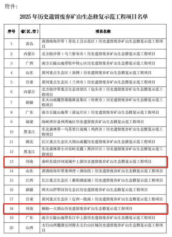 從河南省自然資源廳獲悉,日前,財政部、自然資源部發(fā)布2025年歷史遺留廢棄礦山生態(tài)修復(fù)示范工程項目競爭性選拔結(jié)果,全國共遴選20個項目,我省“河南秦嶺東段沙河流域中上游歷史遺留廢棄礦山生態(tài)修復(fù)示范工程”和“河南桐柏—大別山歷史遺留廢棄礦山生態(tài)修復(fù)示范工程”2個項目成功入選,共獲中央財政獎補(bǔ)資金6億元。