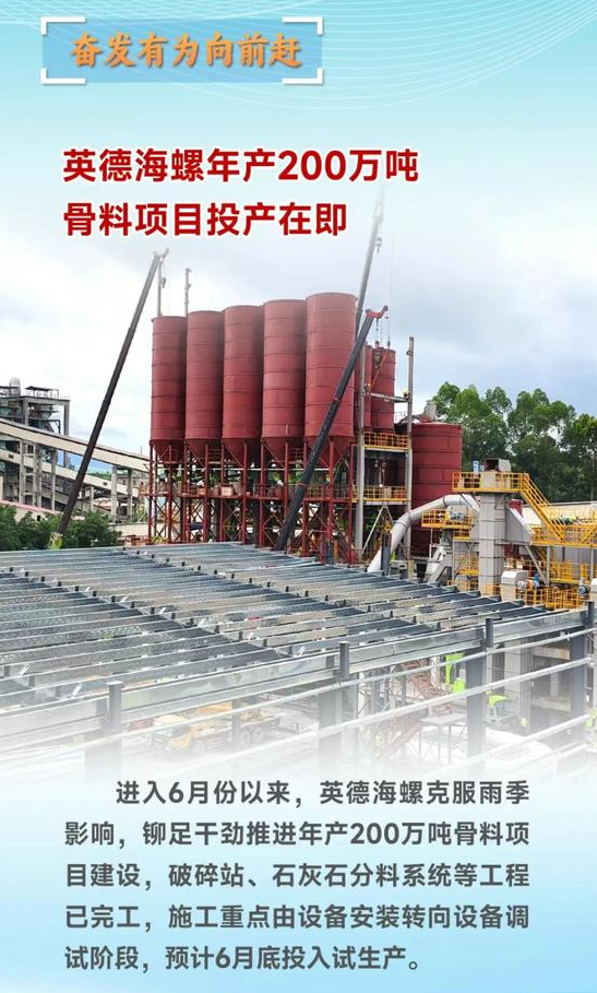 最新消息,進(jìn)入6月份以來(lái),英德海螺正在加速推進(jìn)年產(chǎn)200萬(wàn)噸骨料項(xiàng)目建設(shè),破碎站、石灰石分料系統(tǒng)等工程已完工,施工重點(diǎn)由設(shè)備安裝轉(zhuǎn)向設(shè)備調(diào)試階段,預(yù)計(jì)6月底投入試生產(chǎn)。