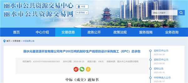 6月25日,浙江省麗水市公共資源交易網(wǎng)公布麗水元基資源開發(fā)有限公司年產(chǎn)200萬噸機制砂生產(chǎn)線項目設(shè)計采購施工(EPC)總承包中標(biāo)結(jié)果。浙江晟元建筑設(shè)計有限公司(牽頭人)、浙江振云建設(shè)有限公司(成員方、云和縣產(chǎn)投控股集團子公司)組成的聯(lián)合體成功中標(biāo)該項目,中標(biāo)價超4532萬元。