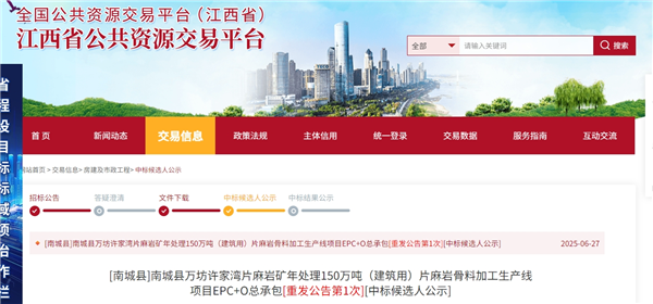 6月27日,江西省公共資源交易平臺(tái)公布撫州市南城縣萬坊許家灣片麻巖礦年處理150萬噸(建筑用)片麻巖骨料加工生產(chǎn)線項(xiàng)目EPC+O總承包中標(biāo)候選人。南城縣金創(chuàng)國有控股集團(tuán)旗下市政建設(shè)有限公司以近3894.8萬元的報(bào)價(jià)擬中標(biāo)該項(xiàng)目,工期365天。