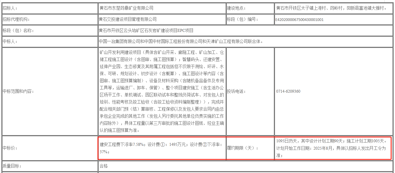 近日,中國一冶集團有限公司、中國中材國際工程股份有限公司、天津礦山工程有限公司聯(lián)合體中標湖北黃石市開鐵區(qū)云頭垴礦區(qū)石灰?guī)r礦建設項目EPC項目。根據(jù)招標公告顯示,該項目合同估算價約61億元,中標價:建安工程費下浮率7.58%,設計費1495萬元。