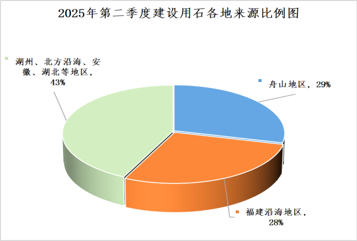 2025年第二季度本市建設(shè)用石來(lái)源:舟山地區(qū)占29%;福建沿海地區(qū)占28%;湖州、北方沿海、安徽、湖北等地區(qū)占43%。