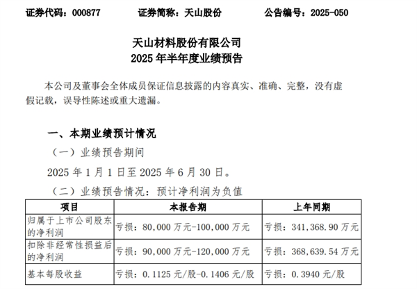 天山股份預(yù)計2025年半年度歸屬于上市公司股東的凈利潤為虧損8億元至10億元,較上年同期大幅減虧。報告期與上年同期相比,業(yè)績變動主要原因系:受水泥銷售價格同比上升,水泥和商品混凝土成本同比下降的影響,經(jīng)營效益同比上升。