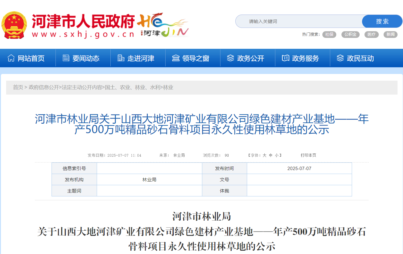 近日,近日山西省運(yùn)城市河津市林業(yè)局發(fā)布關(guān)于山西大地河津礦業(yè)有限公司綠色建材產(chǎn)業(yè)基地——年產(chǎn)500萬(wàn)噸精品砂石骨料項(xiàng)目永久性使用林草地的公示。