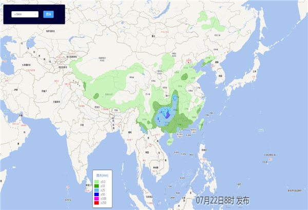 中央氣象臺7月22日10時發(fā)布暴雨藍色預警和臺風藍色預警,“韋帕”風雨影響華南及南部海域,西南華南江南部分地區(qū)有強降雨。經研判,7月22日,100毫米以上降雨范圍無受影響尾礦庫。50毫米~100毫米降雨范圍主要分布在貴州、湖北、湖南3省,共有48座尾礦庫受降雨影響。