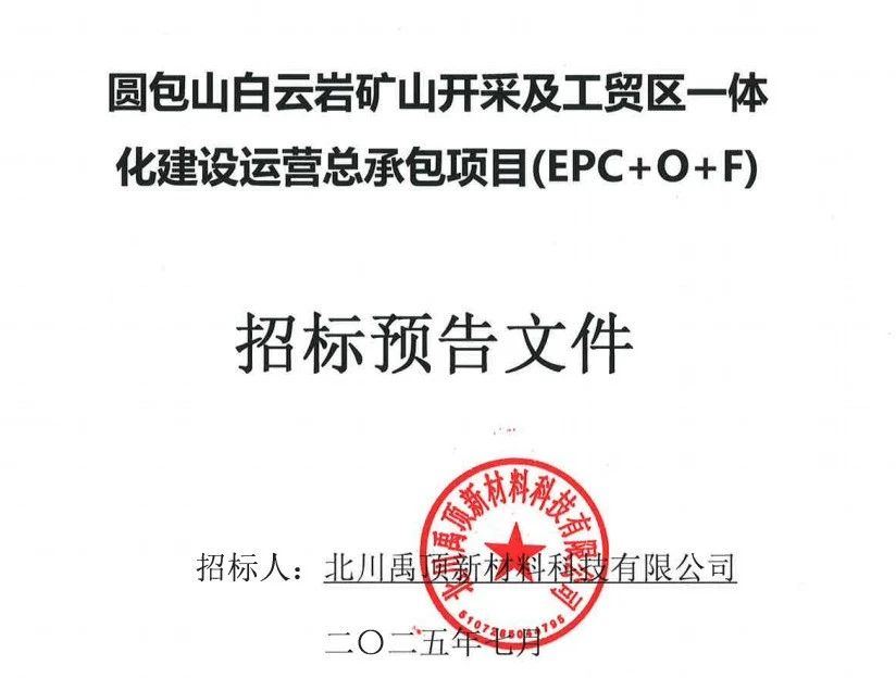 據(jù)悉,四川北川禹頂新材料科技有限公司圓包山白云巖礦山開采及工貿(mào)區(qū)一體化建設(shè)運(yùn)營總承包項(xiàng)目(EPC+O+F)設(shè)計(jì)、采購、施工、運(yùn)營及融資進(jìn)行公開招標(biāo)。