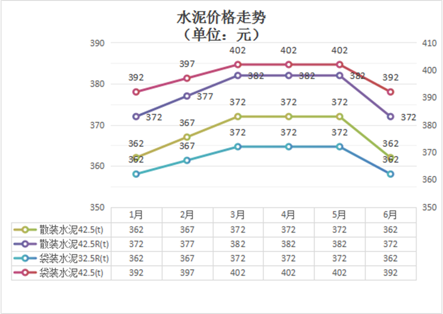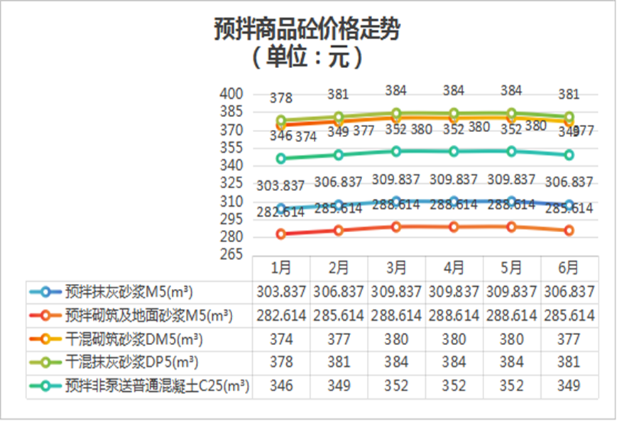 受到水泥價格波動的影響,預(yù)拌砂漿、商品混凝土、干混砂漿等價格趨勢與水泥基本一致,呈現(xiàn)年初上漲年中下跌的趨勢。6月較1月總體上漲約1%。