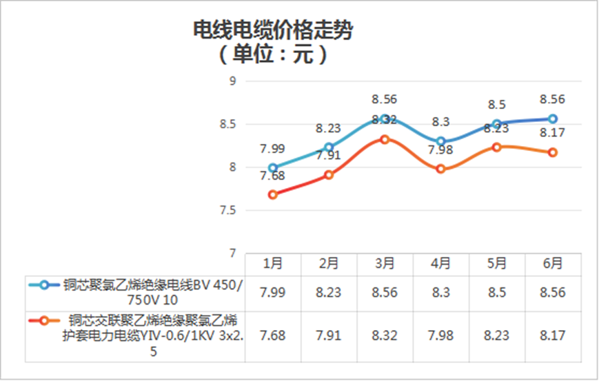電線電纜的價格受銅價及其他原材料成本波動的影響,整體呈現(xiàn)波動上行趨勢,6月較1月總體上升約7%。