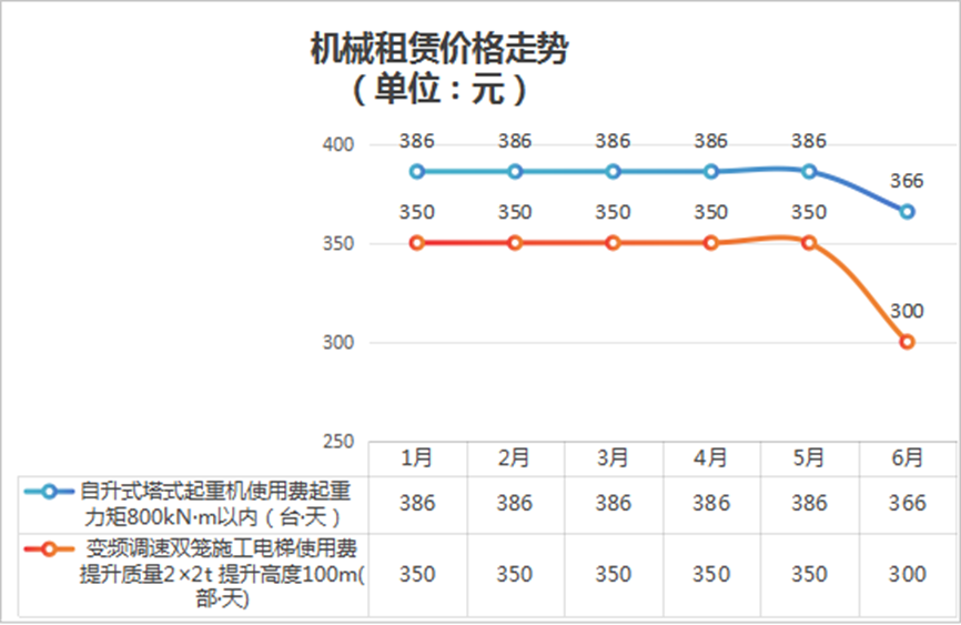 受到市場需求變動及市場競爭加劇的影響,我市機(jī)械租賃價格穩(wěn)中有跌,6月較1月總體下降約5%。