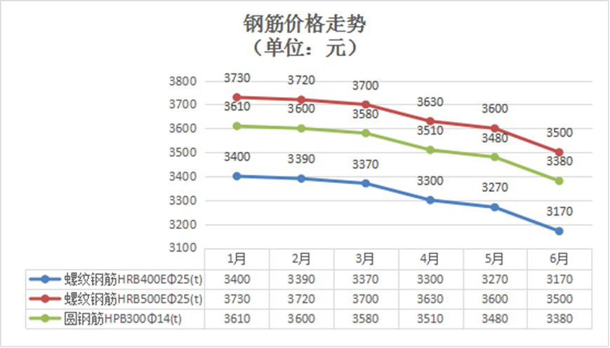由于市場需求下降,鋼筋價格持續(xù)下跌。雖然產(chǎn)能相應(yīng)減少,但仍存在供大于求的情況。6月較1月總體下跌約6.2%。