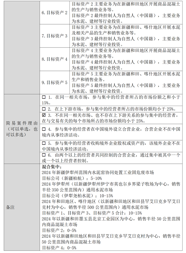 根據(jù)公示內(nèi)容,安徽海螺已與堯柏集團(tuán)、墨玉堯柏水泥有限公司等簽訂協(xié)議,計劃收購以下標(biāo)的:一是伊犁堯柏水泥有限公司、新疆柏航環(huán)保科技有限公司、霍城縣南崗西鑫礦業(yè)有限責(zé)任公司100%的股權(quán)(上述三家合稱“目標(biāo)公司”);二是墨玉堯柏水泥有限公司、墨玉堯柏建材有限公司、和田堯柏水泥有限公司、和田堯柏建材有限公司、和田魯新建材有限公司的資產(chǎn)(上述五項合稱“目標(biāo)資產(chǎn)”)。