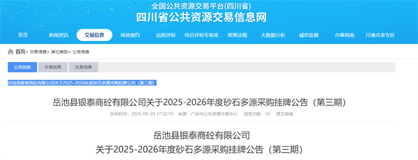 近日,四川省廣安市公共資源交易中心發(fā)布岳池縣銀泰商砼有限公司關(guān)于2025-2026年度砂石多源采購掛牌公告。采購內(nèi)容為山碎石、碎石約27萬噸,石粉約25萬噸,天然砂(河沙)約5萬噸。