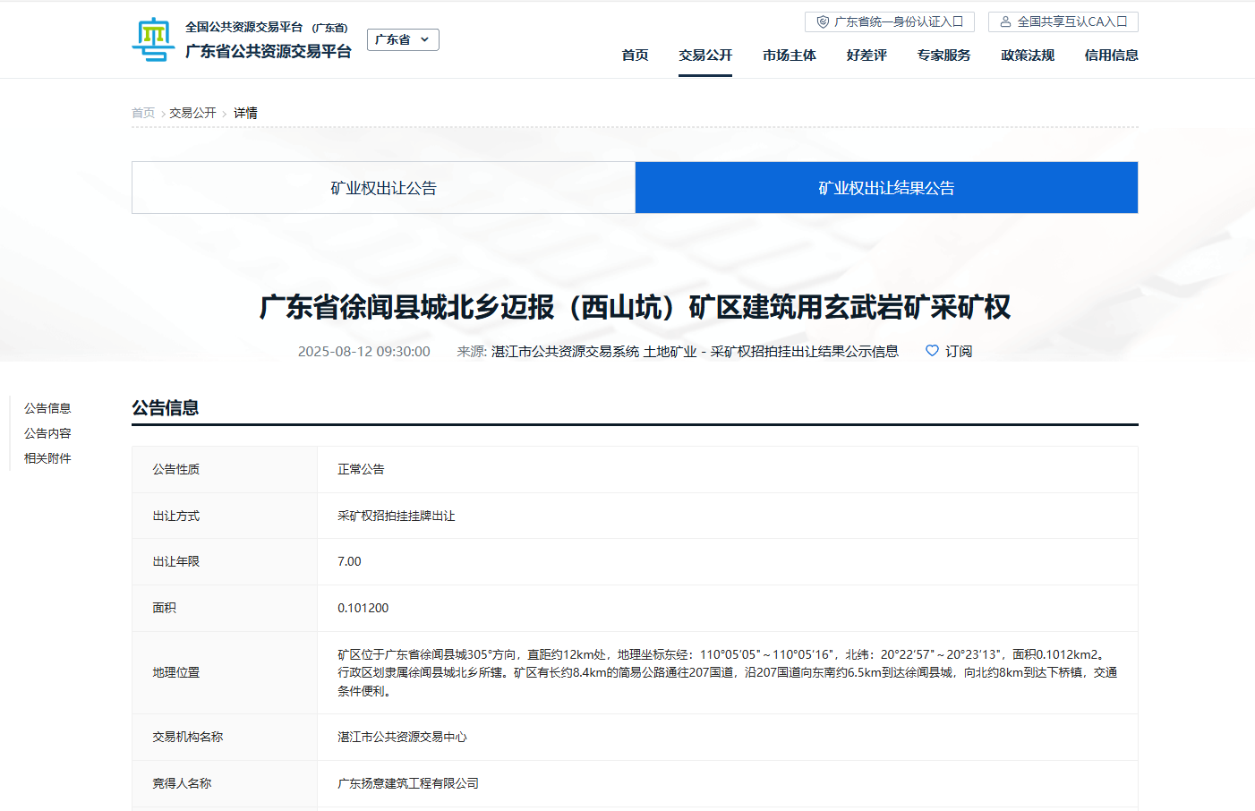 近日,湛江市公共資源交易平臺成功出讓廣東省徐聞縣城北鄉(xiāng)邁報(西山坑)礦區(qū)建筑用玄武巖礦。礦區(qū)范圍內(nèi)查明(保有)建筑用玄武礦礦石資源儲量92.88萬m³,采礦權(quán)出讓年限為7年,生產(chǎn)擬設(shè)規(guī)模為15萬m³/年;起始價為492.84萬元。廣東揚意建筑工程有限公司最終以525.8萬元競得此礦。