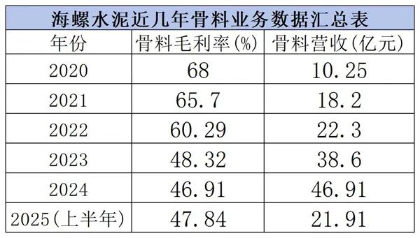 詳細(xì)來(lái)看,在骨料業(yè)務(wù)方面,2020年海螺水泥營(yíng)收10.25億元,毛利率達(dá)68%;?2021年?duì)I收18.2億元,毛利率達(dá)65.7%;?2022年?duì)I收22.3億元,毛利率60.29%,總產(chǎn)能突破1億噸;2023年?duì)I收38.6億元,毛利率48.32%,銷量同比增51%;2024年?duì)I收46.91億元,毛利率46.91%;2025上半年?duì)I收21.11億元,毛利率達(dá)43.87%。