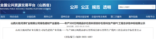 8月26日,山西省公共資源交易平臺(tái)發(fā)布山西大地河津礦業(yè)有限公司綠色建材產(chǎn)業(yè)基地——年產(chǎn)500萬噸精品砂石骨料項(xiàng)目PC工程總承包中標(biāo)結(jié)果。山西二建集團(tuán)有限公司成功中標(biāo)該項(xiàng)目,中標(biāo)價(jià)近2.94億元。