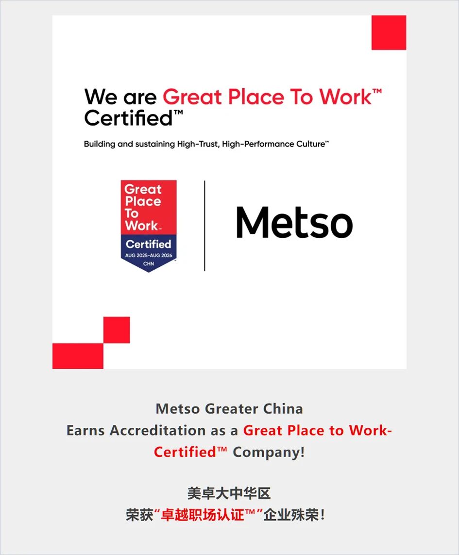 我們很榮幸地宣布:自2025年8月26日起,美卓(Metso)大中華區(qū)被正式認(rèn)證成為“卓越職場認(rèn)證™”(Great Place to Work-Certified™)企業(yè)!